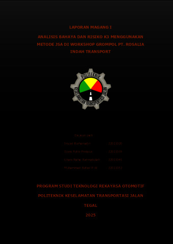 PRAKOSA, DZAKI PUTRA and BURHANUDIN, IRSYAD and WAHYUDI, MUHAMMAD RAFAEL PUTRA and RAHMATULLAH, GHANI RIDHO (2025) LAPORAN MAGANG I ANALISIS BAHAYA DAN RISIKO K3 MENGGUNAKAN METODE JSA DI WORKSHOP GROMPOL PT. ROSALIA INDAH TRANSPORT. Project Report. POLITEKNIK KESELAMATAN TRANSPORTASI JALAN, TEGAL. (Submitted)