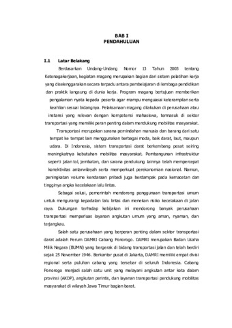 Magang I merupakan kegiatan pembelajaran lapangan yang bertujuan untuk memberikan pengalaman kerja secara langsung kepada taruna di lingkungan dunia industri dan transportasi. Kegiatan magang ini dilaksanakan di Perum DAMRI Cabang Ponorogo sebagai sarana untuk memahami sistem operasional perusahaan, khususnya pada bidang perawatan kendaraan, keselamatan kerja, serta pelayanan transportasi umum. Selama pelaksanaan magang, taruna terlibat dalam aktivitas pada Divisi Teknik serta Divisi Pemasaran dan Pengembangan Usaha melalui kegiatan observasi, pendampingan pekerjaan, dan pengumpulan data lapangan. Dalam aspek keselamatan kerja, dilakukan identifikasi potensi bahaya di area bengkel guna mengetahui tingkat risiko yang mungkin terjadi serta upaya pengendalian yang dapat diterapkan. Selain itu, taruna juga berperan dalam mendukung kegiatan promosi layanan transportasi DAMRI melalui pemanfaatan media digital sebagai upaya peningkatan minat dan jumlah pengguna jasa. Hasil dari kegiatan magang menunjukkan bahwa penerapan prosedur kerja yang sesuai standar, peningkatan kesadaran terhadap keselamatan kerja, serta strategi promosi yang tepat berpengaruh terhadap kelancaran operasional dan kualitas pelayanan perusahaan. Kegiatan magang ini diharapkan dapat menjadi bekal pengetahuan dan pengalaman bagi taruna serta memberikan kontribusi positif bagi pengembangan Perum DAMRI Cabang Ponorogo. Kata kunci: Magang, Perum DAMRI, Transportasi Umum, Keselamatan dan Kesehatan Kerja, HIRADC, Digital Marketing
