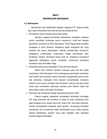 Laporan magang ini disusun berdasarkan pelaksanaan praktik kerja lapangan di PT Mekar Armada Jaya yang berfokus pada Divisi Stamping & Tools dan Divisi Karoseri dengan tujuan memahami alur proses produksi, keterkaitan antar divisi, serta penerapan Keselamatan dan Kesehatan Kerja (K3). Metode yang digunakan meliputi observasi langsung, pengumpulan data teknis, dan keterlibatan dalam aktivitas operasional. Hasil magang menunjukkan bahwa proses manufaktur kendaraan berjalan secara terintegrasi, dimulai dari pembuatan komponen logam hingga perakitan bodi kendaraan, didukung oleh sinergi kedua divisi untuk menjaga efisiensi dan kualitas produk. Selain itu, dilakukan pembaruan Standar Operasional Prosedur (SOP) pada beberapa line produksi yang meningkatkan konsistensi kerja operator serta menurunkan potensi cacat produksi, disertai penerapan Sistem Manajemen K3 berbasis SNI ISO 45001:2018. Kontribusi lainnya adalah perancangan aplikasi input data otomatis berbasis VBA Excel pada Line Small Press bagian Metal Finish yang mempercepat pencatatan, mengurangi kesalahan input, dan mempermudah evaluasi kinerja, sehingga secara keseluruhan kegiatan magang memberikan pemahaman komprehensif mengenai sistem operasional industri karoseri modern serta meningkatkan kesiapan mahasiswa menghadapi dunia kerja manufaktur otomotif