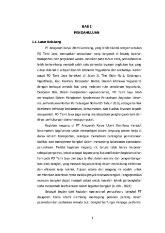 Kegiatan magang merupakan salah satu bentuk pembelajaran yang bertujuan untuk memberikan pengalaman kerja nyata kepada mahasiswa di dunia industri. Kegiatan magang ini dilaksanakan di PT Anugerah Karya Utami Gemilang (PO Tami Jaya), sebuah perusahaan yang bergerak di bidang jasa transportasi angkutan penumpang dan perjalanan wisata. Tujuan dari kegiatan magang ini adalah untuk menganalisis kondisi tata letak bengkel yang ada serta merancang ulang tata letak bengkel agar lebih efisien, ergonomis, dan sesuai dengan standar bengkel otomotif. Metode yang digunakan dalam kegiatan ini meliputi observasi langsung terhadap kondisi bengkel, identifikasi permasalahan pada alur kerja dan penempatan fasilitas, serta analisis kebutuhan ruang berdasarkan aktivitas perawatan dan perbaikan armada bus. Selanjutnya dilakukan proses perancangan ulang tata letak bengkel menggunakan perangkat lunak AutoCAD dan SketchUp untuk menghasilkan desain yang lebih optimal. Hasil analisis menunjukkan bahwa tata letak bengkel yang ada masih memiliki beberapa kendala, seperti pencampuran area parkir dengan area perbaikan, jarak antara bengkel dan gudang suku cadang yang cukup jauh, serta alur kerja teknisi yang kurang efisien. Oleh karena itu, dilakukan redesain tata letak dengan menerapkan prinsip facility layout, zonasi fungsional, serta memperhatikan aspek keselamatan dan kenyamanan kerja. Redesain yang diusulkan diharapkan dapat meningkatkan efisiensi operasional bengkel, memperlancar alur kerja teknisi, serta mendukung peningkatan kinerja perawatan armada bus di PT Anugerah Karya Utami Gemilang. Selain itu, kegiatan magang ini juga memberikan pengalaman praktis bagi mahasiswa dalam menerapkan konsep perancangan fasilitas kerja di lingkungan industri transportasi.
