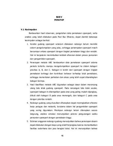 Pengelolaan gudang sparepart merupakan salah satu faktor penting dalam mendukung kelancaran operasional dan perawatan armada bus. Berdasarkan hasil observasi di Pool Bus Efisiensi, ditemukan bahwa tata letak gudang sparepart masih belum optimal ditandai dengan penempatan barang yang tidak terstruktur, waktu pencarian sparepart yang relatif lama, serta pencatatan stok yang masih dilakukan secara manual. Kondisi tersebut berpotensi menimbulkan keterlambatan perbaikan kendaraan dan ketidakefisienan kerja. Penelitian ini bertujuan untuk menganalisis kondisi eksisting tata letak gudang, mengklasifikasikan sparepart menggunakan metode ABC, serta merancang ulang tata letak gudang agar lebih efisien. Metode yang digunakan adalah metode ABC untuk mengelompokkan sparepart berdasarkan tingkat kepentingan dan frekuensi pemakaian, yang kemudian diterapkan dalam penataan gudang dengan pendekatan class-based storage. Hasil penelitian menunjukkan bahwa sparepart kategori A merupakan barang dengan frekuensi penggunaan tertinggi sehingga harus ditempatkan pada area yang paling mudah dijangkau, kategori B pada area menengah, dan kategori C pada area yang jarang diakses. Penerapan redesign tata letak gudang berdasarkan metode ABC mampu meningkatkan efisiensi waktu pengambilan sparepart serta mempermudah proses pengelolaan dan pengendalian persediaan. Dengan demikian, redesign tata letak gudang menggunakan metode ABC dapat menjadi solusi yang efektif untuk meningkatkan kinerja operasional gudang sparepart di Pool Bus Efisiensi. Kata kunci: gudang sparepart, metode ABC, tata letak gudang, efisiensi, class-based storage