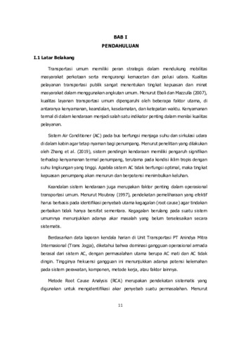 Transportasi umum memiliki peran penting dalam mendukung mobilitas masyarakat perkotaan serta meningkatkan kualitas pelayanan transportasi publik. Salah satu faktor yang mempengaruhi kenyamanan penumpang adalah kinerja sistem Air Conditioner (AC) pada kendaraan. Berdasarkan data laporan kendala harian di Unit Transportasi PT Anindya Mitra Internasional sebagai pengelola Bus Trans Jogja, diketahui bahwa gangguan operasional armada didominasi oleh permasalahan pada sistem AC, khususnya AC mati dan AC tidak dingin. Permasalahan ini berpotensi menurunkan tingkat kenyamanan penumpang serta kualitas pelayanan transportasi publik. Penelitian ini bertujuan untuk mengidentifikasi jenis dan frekuensi kendala pada sistem AC armada Bus Trans Jogja, menganalisis akar penyebab terjadinya gangguan menggunakan metode Root Cause Analysis (RCA), serta memberikan rekomendasi perbaikan untuk meminimalkan terjadinya kendala serupa. Data yang digunakan dalam penelitian ini berupa data laporan kendala harian armada bus pada periode Juni hingga Desember 2025 yang diperoleh dari Unit Transportasi PT Anindya Mitra Internasional. Hasil analisis menggunakan metode RCA menunjukkan bahwa gangguan pada sistem AC dipengaruhi oleh beberapa faktor utama, antara lain faktor komponen, metode perawatan, serta faktor manusia dalam proses pengoperasian dan pemeliharaan kendaraan. Berdasarkan hasil analisis tersebut, diberikan beberapa rekomendasi perbaikan guna meningkatkan keandalan sistem AC serta mendukung peningkatan kualitas pelayanan Bus Trans Jogja